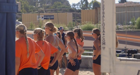 Members of the Pepperdine Women’s Beach Volleyball team watch a match during practice. The team is comprised of eight returners and eight newcomers. Photo by Katherine Lytle